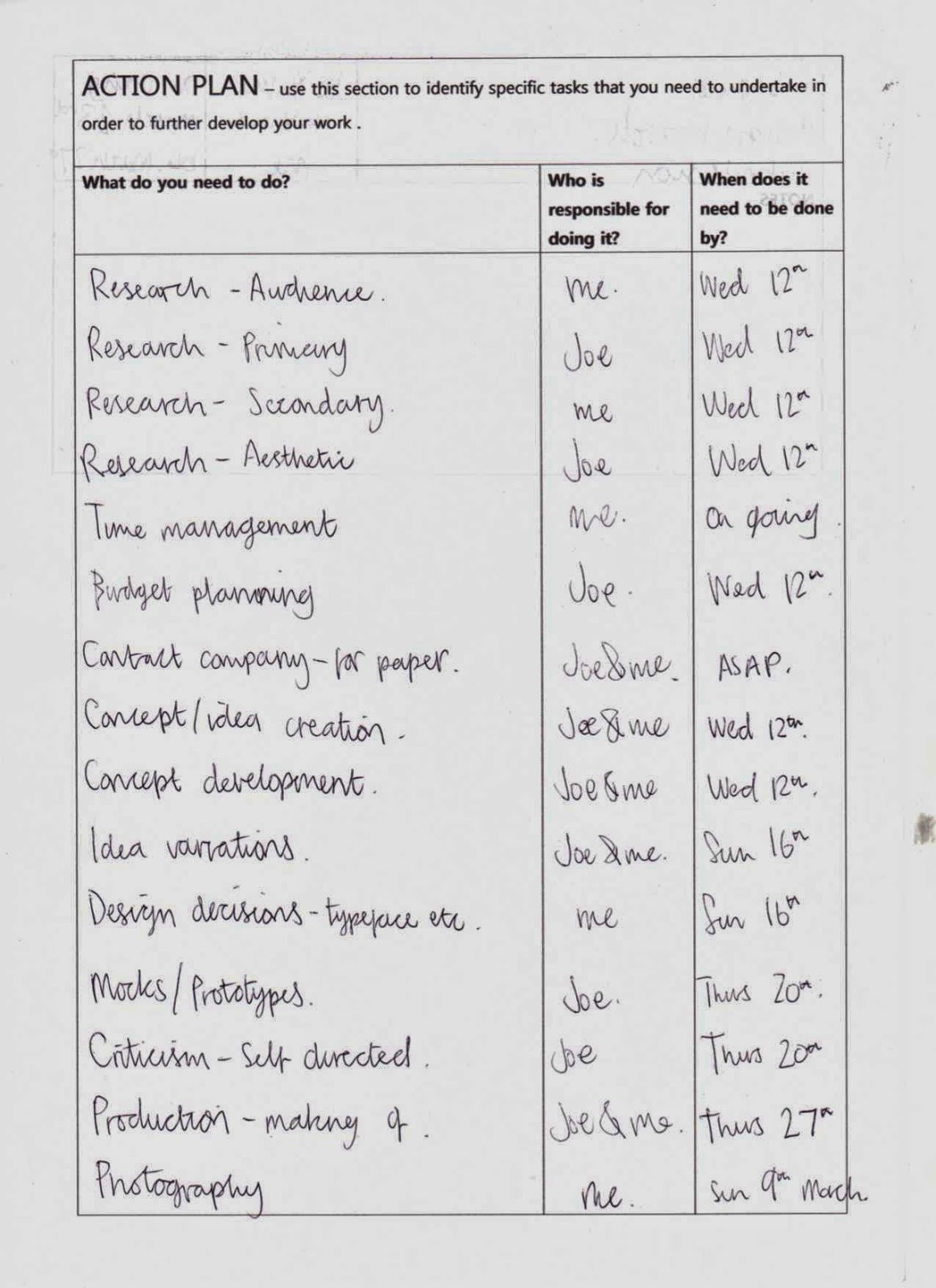 Action plans like the one displayed below are a vital aspect of the project as they will help to keep both me and joe organised throughout the projects duration. I have outlined myself as the project organiser for the brief and so will be in charge of creating action plans and to do lists for the group.